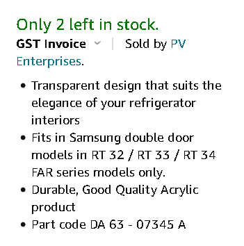 1. IT WILL BE FITTING AT MIDDLE REF DOOR. 2. IT IS ONLY FOR SAMSUNG DOUBLE DOOR FRIDGE OLD MODEL BEFORE 2015 ONLY. 3. IT IS COMPATIBLE FOR 220 LITRE TO 280 LITRE FRIDGE BUT SAMSUNG BRAND. 4. IT REPLACEMENT OF BOTTLE SHELF PART NO DA63-07345 MATCHED THEN ORDER. A fridge door bottle rack is an essential component of a refrigerator, designed to organize and securely hold bottles such as milk, juice, or wine on the refrigerator door. Typically made from durable materials like plastic or metal, these racks come in various sizes and configurations to accommodate different bottle types and refrigerator models.​ BuySpares Key Features: Material: Most bottle racks are constructed from sturdy plastic or metal to ensure longevity and support the weight of bottles.​ Design: They are designed to fit seamlessly into the door of the fridge, optimizing space and ensuring easy access to stored bottles.​ Dimensions: Sizes vary to fit different refrigerator models. For example, a standard rack might measure approximately 445 x 105 x 105 mm. ​ Darel+3BuySpares+3BuySpares+3 Compatibility: It's crucial to select a bottle rack compatible with your refrigerator's brand and model. Manufacturers often provide compatibility information to assist in choosing the correct rack.​ Darel+4BuySpares+4BuySpares+4 Benefits: Space Optimization: Properly organizing bottles on the door shelf frees up space on internal shelves for other items.​ Accessibility: Having bottles on the door allows for easy retrieval, especially for frequently used items.​ Safety: A secure bottle rack prevents bottles from tipping over or rolling, reducing the risk of spills and breakages.​ Replacement Considerations:
