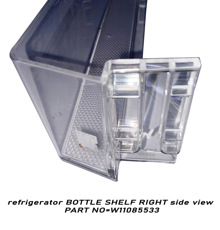 1. IT WILL BE FITTING AT THIRD SLOT FROM BOTTOM & SECOND FROM BOTTOM SLOT OF REF DOOR. 2. IT IS ONLY FOR WHIRLPOOL TRIPPLE DOOR FRIDGE MODEL ONLY. 3. IT IS COMPATIBLE FOR 250 LITRE TO 350 LITRE FRIDGE BUT WHIRLPOOL BRAND. 4. IT REPLACEMENT OF BOTTLE SHELF PART NO W11085533 MATCHED THEN ORDER. A fridge door bottle rack is an essential component of a refrigerator, designed to organize and securely hold bottles such as milk, juice, or wine on the refrigerator door. Typically made from durable materials like plastic or metal, these racks come in various sizes and configurations to accommodate different bottle types and refrigerator models.​ BuySpares Key Features: Material: Most bottle racks are constructed from sturdy plastic or metal to ensure longevity and support the weight of bottles.​ Design: They are designed to fit seamlessly into the door of the fridge, optimizing space and ensuring easy access to stored bottles.​ Dimensions: Sizes vary to fit different refrigerator models. For example, a standard rack might measure approximately 445 x 105 x 105 mm. ​ Darel+3BuySpares+3BuySpares+3 Compatibility: It's crucial to select a bottle rack compatible with your refrigerator's brand and model. Manufacturers often provide compatibility information to assist in choosing the correct rack.​ Darel+4BuySpares+4BuySpares+4 Benefits: Space Optimization: Properly organizing bottles on the door shelf frees up space on internal shelves for other items.​ Accessibility: Having bottles on the door allows for easy retrieval, especially for frequently used items.​ Safety: A secure bottle rack prevents bottles from tipping over or rolling, reducing the risk of spills and breakages.​ Replacement Considerations: