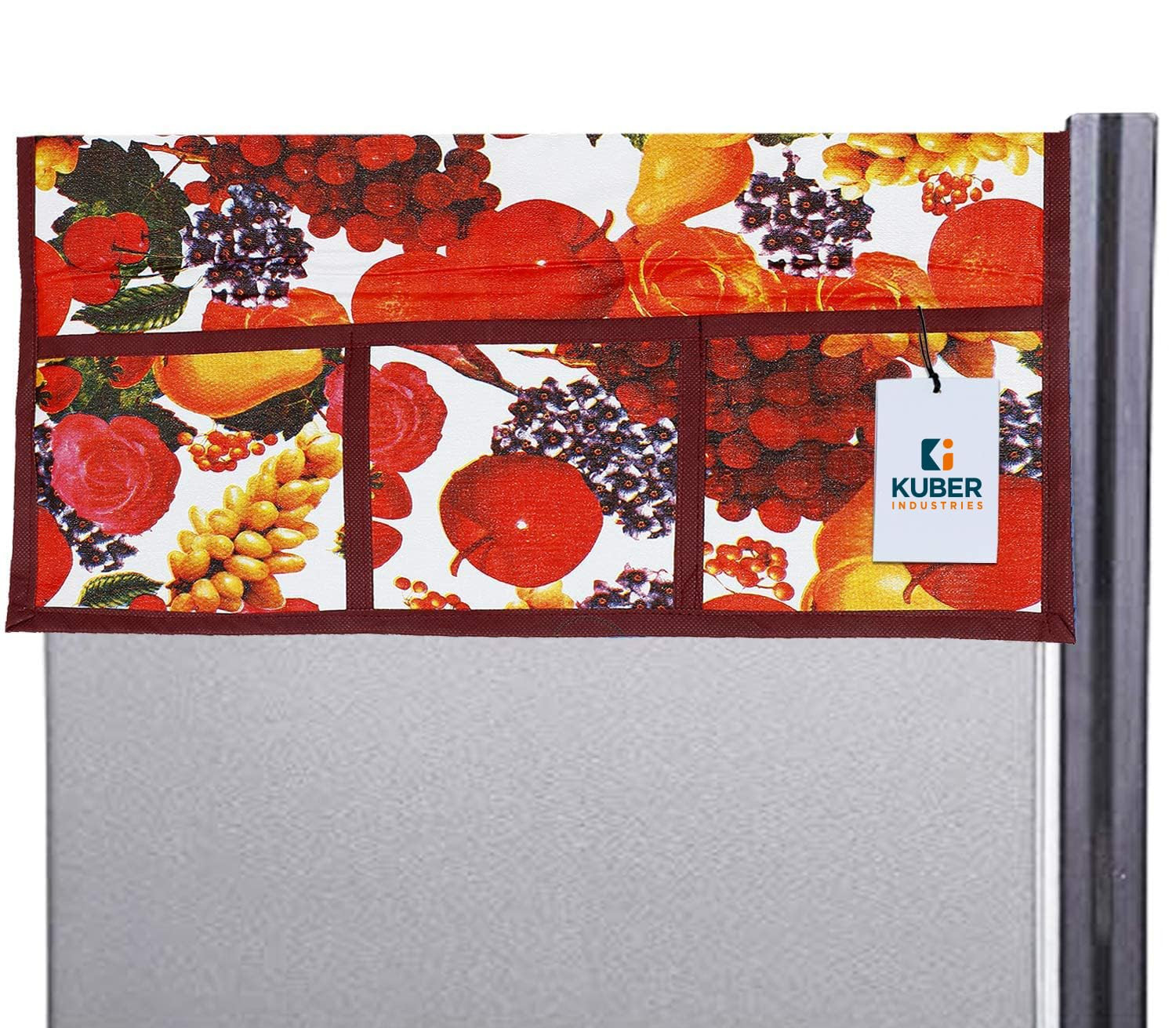 Tiksha Enterprises Fruit Print Fridge Cover With Side Pockets|Fridge Top Cover|Refrigerator Single Door Cover|Washable Cotton Material|6 Utility Pockets Red
